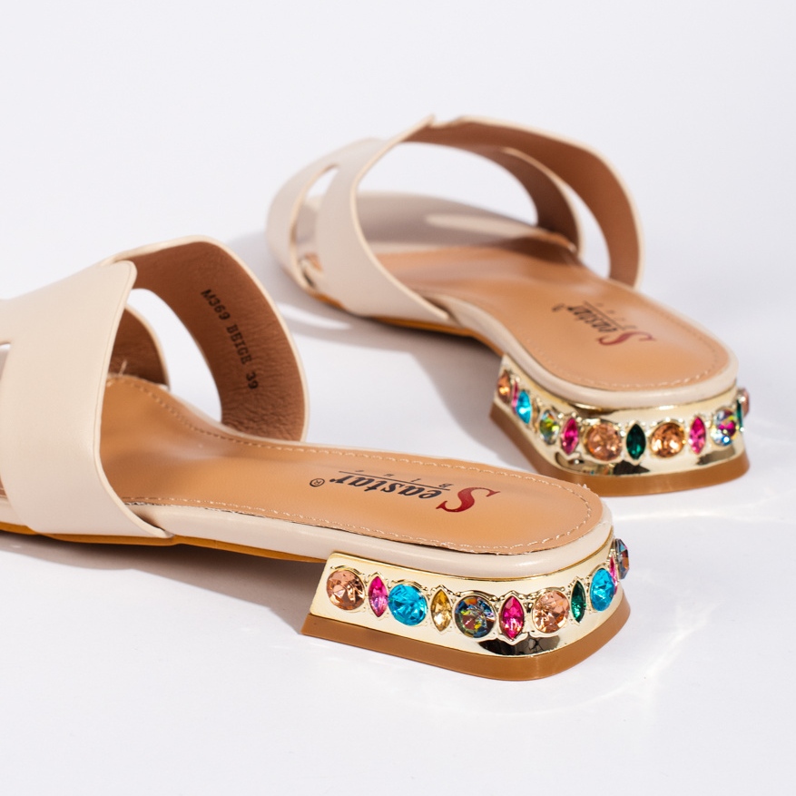 Ezt a modellt egy csúszó rögzítő és egy nyitott sarok jellemzi, amely gyorsan és egyszerűvé teszi őket. A tartós műanyagból készült sima talp biztosítja a stabilitást és a kényelmet sétáláskor. Ezenkívül a finom strasszok elegáns akcentust adnak a szárnyaknak, így tökéletesen belekeverednek mind a napi stilizációkba, mind az elegánsabb ruhákba.