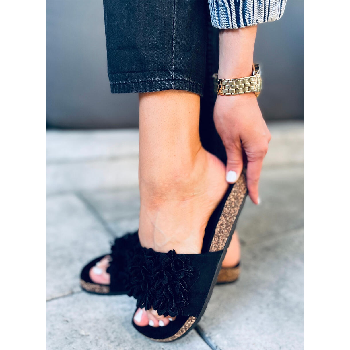 Fedezze fel a tökéletes nyári papucsokat - Berry Black fekete parafa papucsokat, amelyek ötvözik az eleganciát és a kényelmet. Ezek a kiváló minőségű ökológiai velúrból készült női papucsok finom virágmintájukkal vonzzák a figyelmet, amely varázslatot kölcsönöz minden nyári stílusnak.