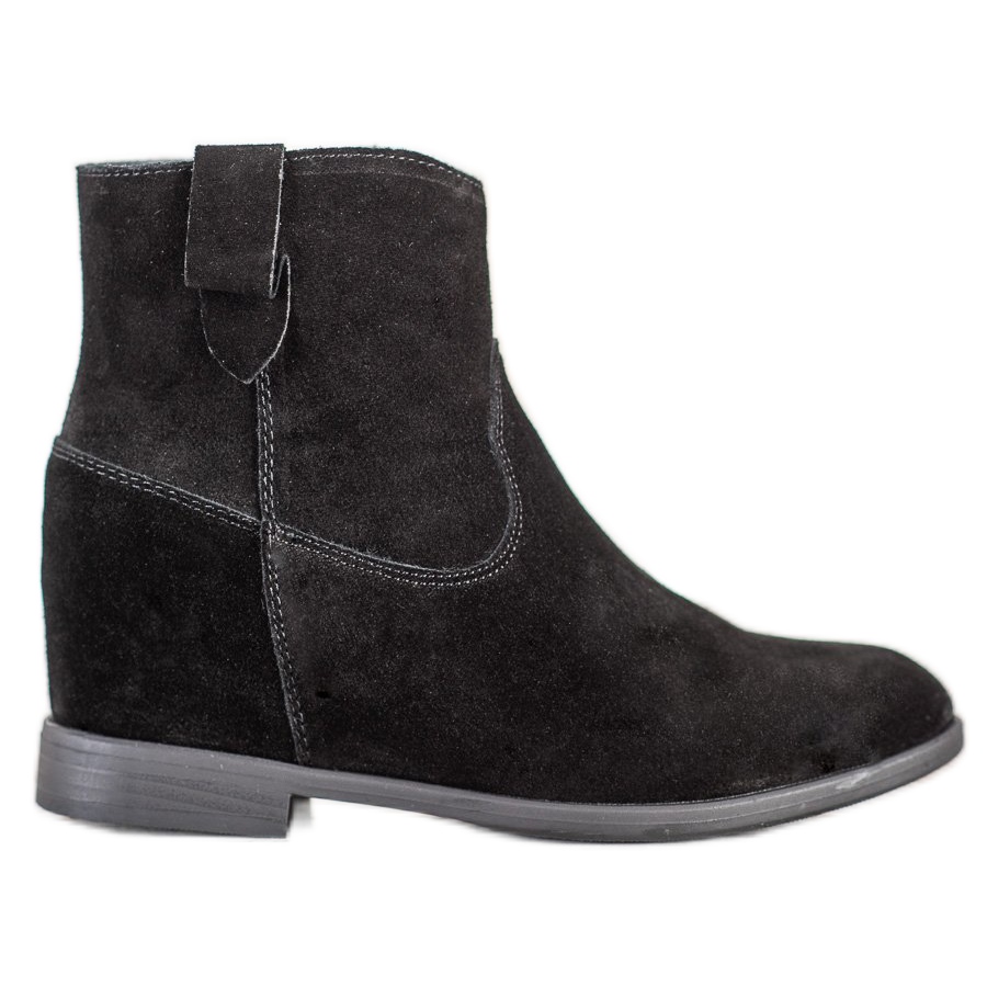 A kerek orrnak és a beépített puha saroknak köszönhetően ezek a cipők maximális viselési kényelmet biztosítanak. A magas, 8 cm-es ék tökéletesen kiemeli az alakot, a sima, szintetikus talp pedig stabilitást biztosít minden lépésnél. A csizmák szigeteléssel is rendelkeznek, így ideális választás az őszi-téli szezonra.