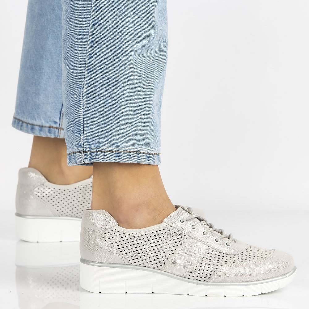 A műanyag talpa kivételes könnyedségével lenyűgöz, így ezek a cipők ideális megoldást jelentenek a mindennapi sétákhoz vagy a barátokkal való kiránduláshoz. A 6 cm-es felső magasság finom eleganciát ad, a talp fehér színe pedig gyönyörű kontrasztban van a dekoratív ezüst kivitelben.