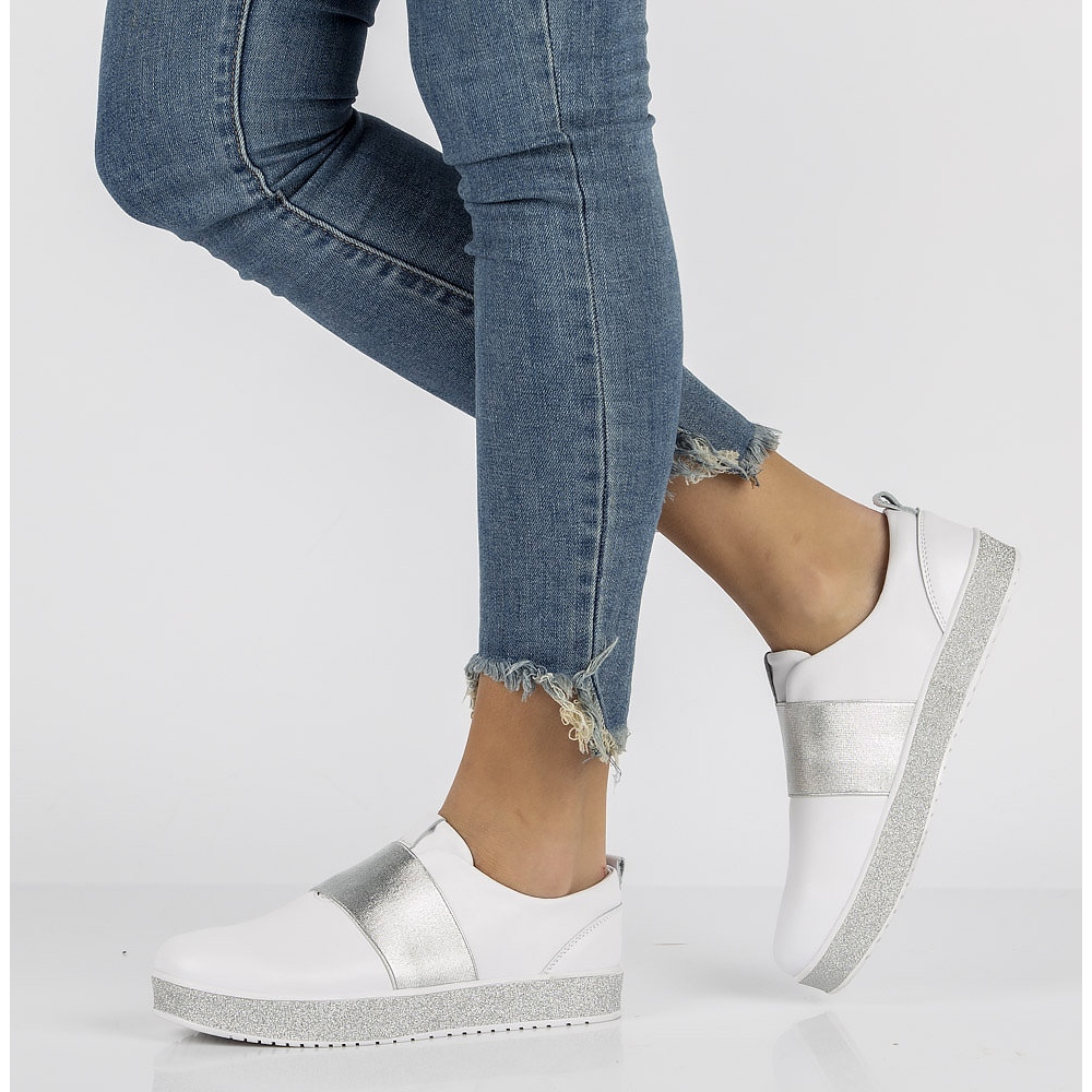 Ezek a fehér cipők univerzálisak, és tökéletesen passzolnak különféle stílusokhoz - hétköznapi és kissé elegánsabb stílusokhoz. A minták hiánya miatt könnyen kombinálhatók más ruhadarabokkal. A G szélesség biztosítja a megfelelő illeszkedést a lábfejhez, a rugalmas műanyag talp pedig a szükséges párnázást.