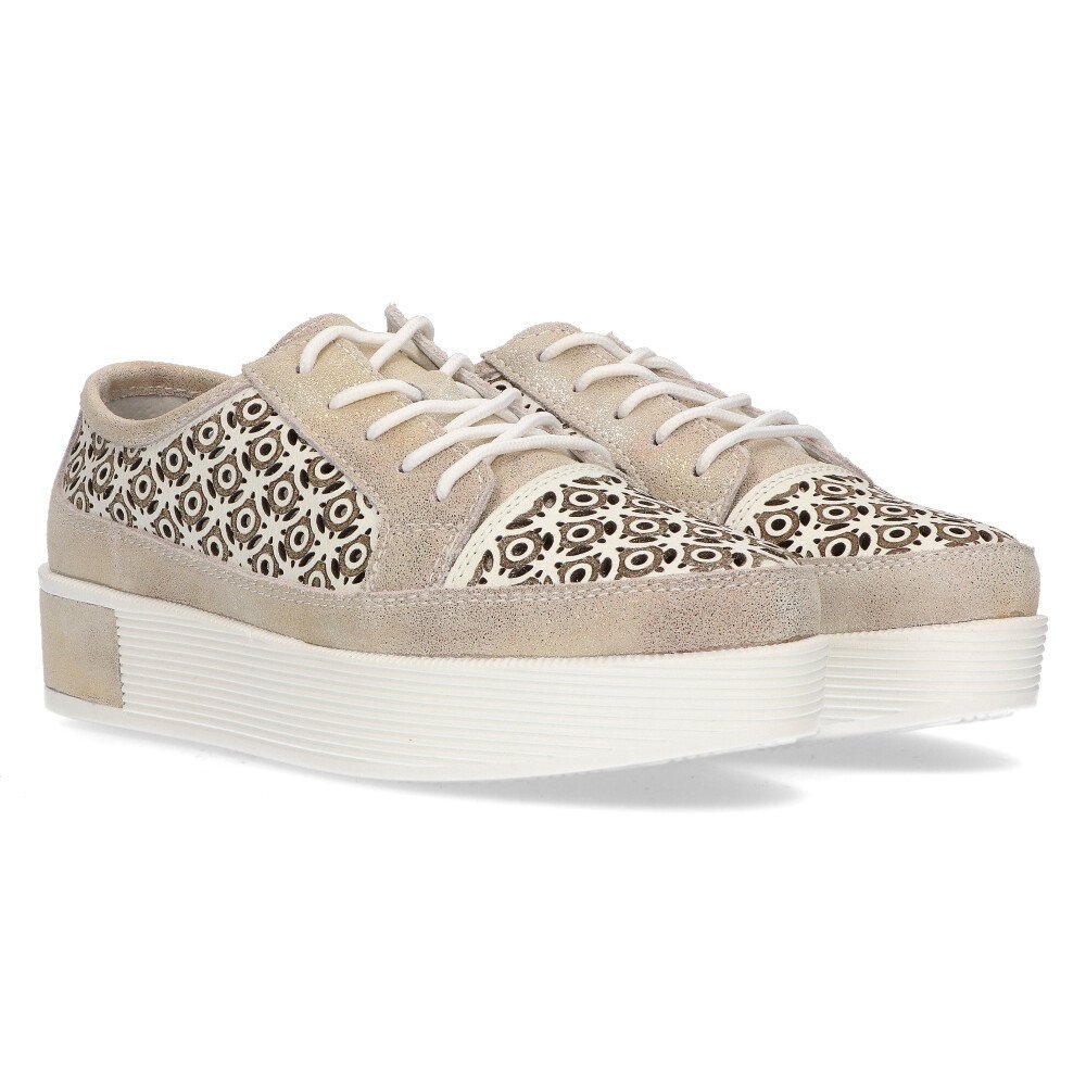 A kiváló minőségű természetes bőrből készült cipőt kerek orr és fűzős rögzítés jellemzi, amely tökéletes illeszkedést tesz lehetővé a lábfejhez. Az arany szín kiemeli a cipőket a többi közül, így tökéletes választás mindennapi kirándulásokra és igényesebb alkalmakra egyaránt.