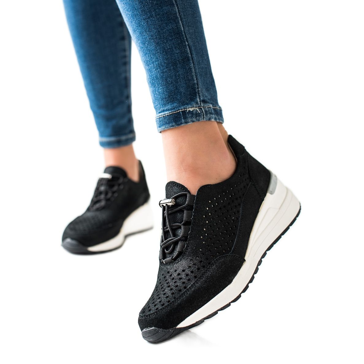 A fekete VINCEZA bőr tornacipők Glitterrel ideális választás azoknak a nőknek, akik értékelik a stílus és a kényelem kombinációját a mindennapi stílusban. Kiváló minőségű természetes bőrből készültek, nem csak vonzó megjelenést, de viselési kényelmet is biztosítanak. Puha, beépített sarkuk stabilitást biztosít, a kerek orr pedig könnyedséget ad.