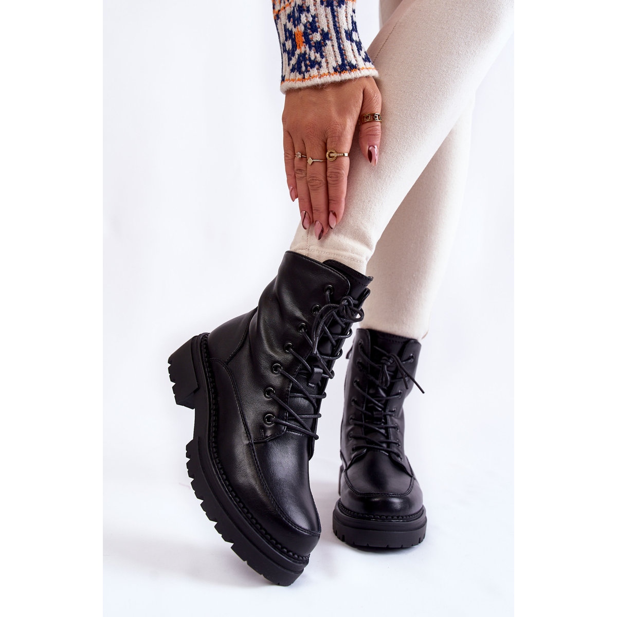 A csizmák puha lábbelitakaróval vannak szigetelve, így tökéletes választás a hidegebb napokra. A cipzárnak és a fűzős felsőnek köszönhetően könnyen felvehetők és tökéletesen illeszkednek a lábfejhez. A lapos, 4,5 cm magas sarok és a barázdákkal ellátott platform biztosítja a kényelmet viselés közben, a merevített sarok pedig a stabilitást hangsúlyozza.