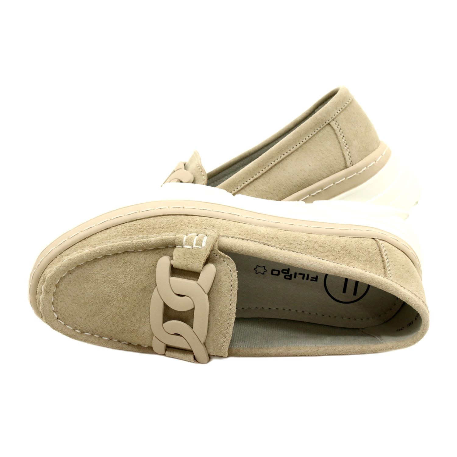 A mokaszinok egyedi dizájnját egy finom bézs lánc jellemzi, amely karaktert és modernséget kölcsönöz nekik. A vastagabb, 5 centiméter magas talp stabilitást biztosít járás közben, és egyben kiemeli a cipő elegáns megjelenését. Ezenkívül a puha szivaccsal bélelt belső bőrbetét egész napos kényelmes viselést tesz lehetővé, ami különösen fontos a hosszú séták során.