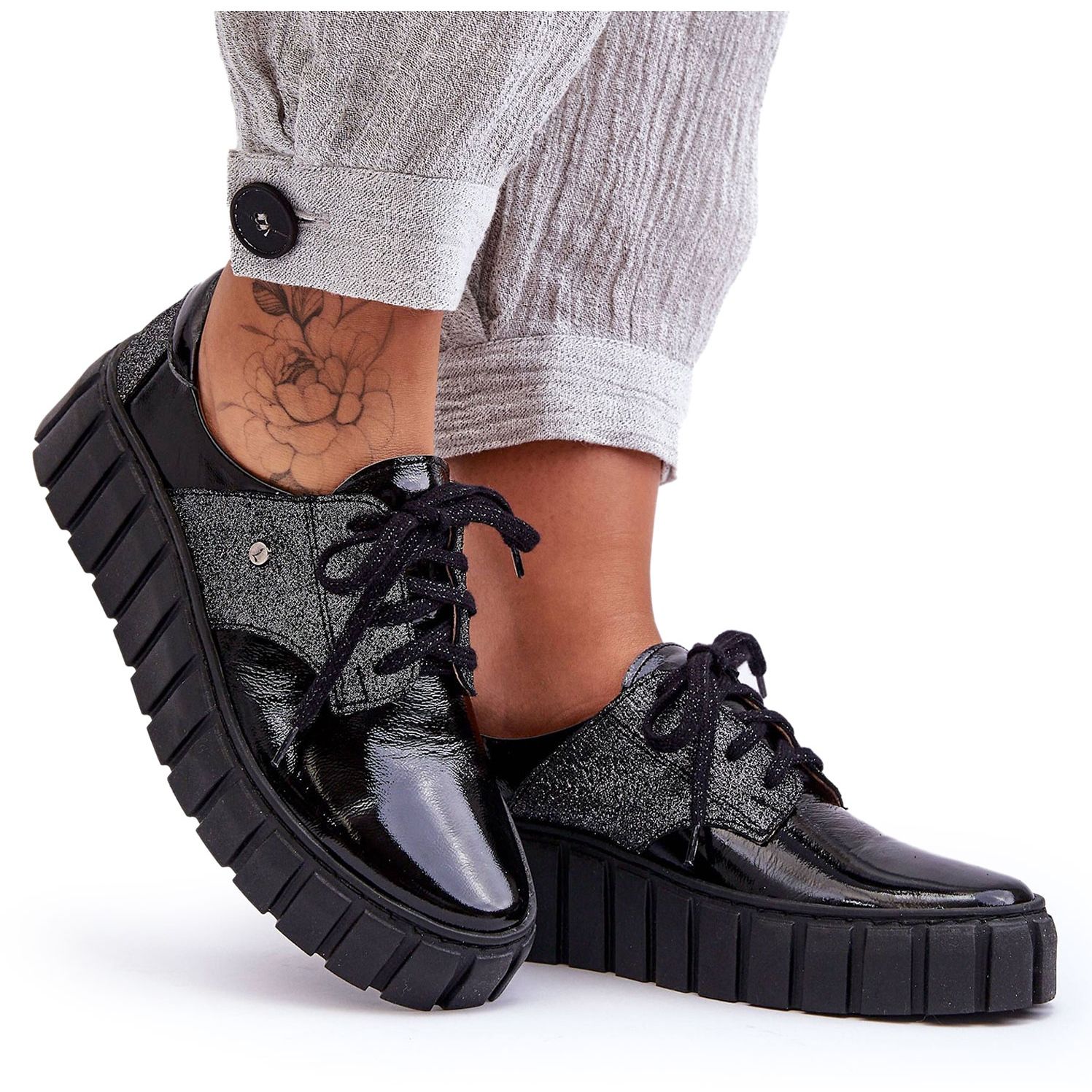 Elegáns és modern női cipő a Lemar -tól, amelyek kombinálják a viselkedés kényelmét egy divatos, kifejező megjelenéssel. A fényes természetes bőrből (fekete öntés), csillogó akcentussal, díszített csipkékkel, fényes szálú és egy hatalmas, táplált platformon (4,5 cm) készül, hatékony, ugyanakkor az univerzális modell ideális az őszi/téli szezonra.