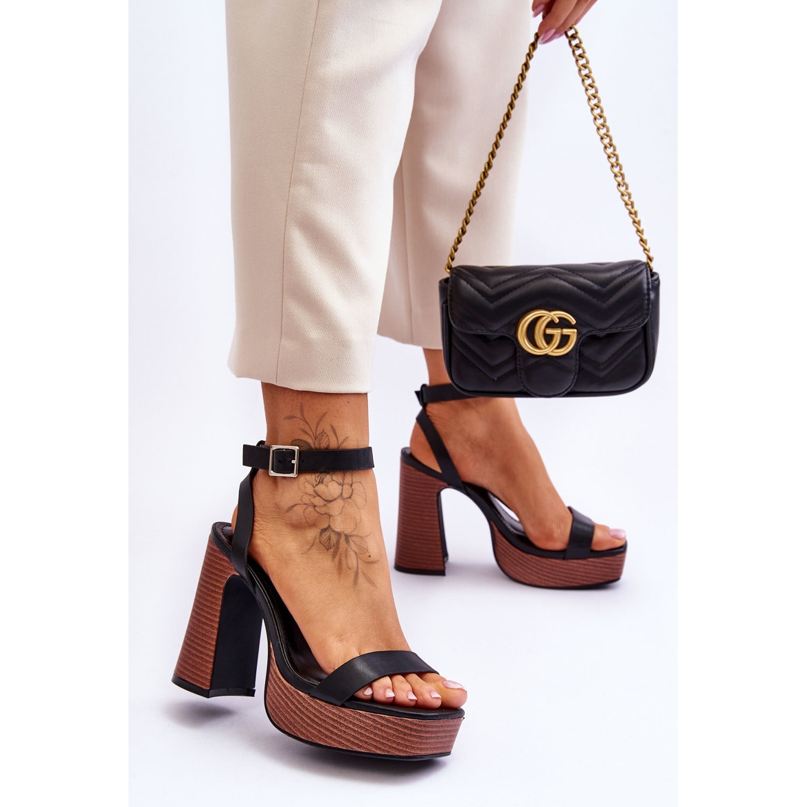 Az ökológiai bőrből készült elegáns és kifejező női szandál -kikötő ideális javaslat a tavaszi/nyári szezonra. A 11,5 cm magas, egy 3 cm -es platformon lévő hatalmas, bár sarokra helyezve egy divatos megjelenést és a stabil szerkezet kényelmét kombinálják. A modell nyitott, négyzet alakú orrával és nyitott sarkával rendelkezik, beállítható, beállítható övvel rögzítve.