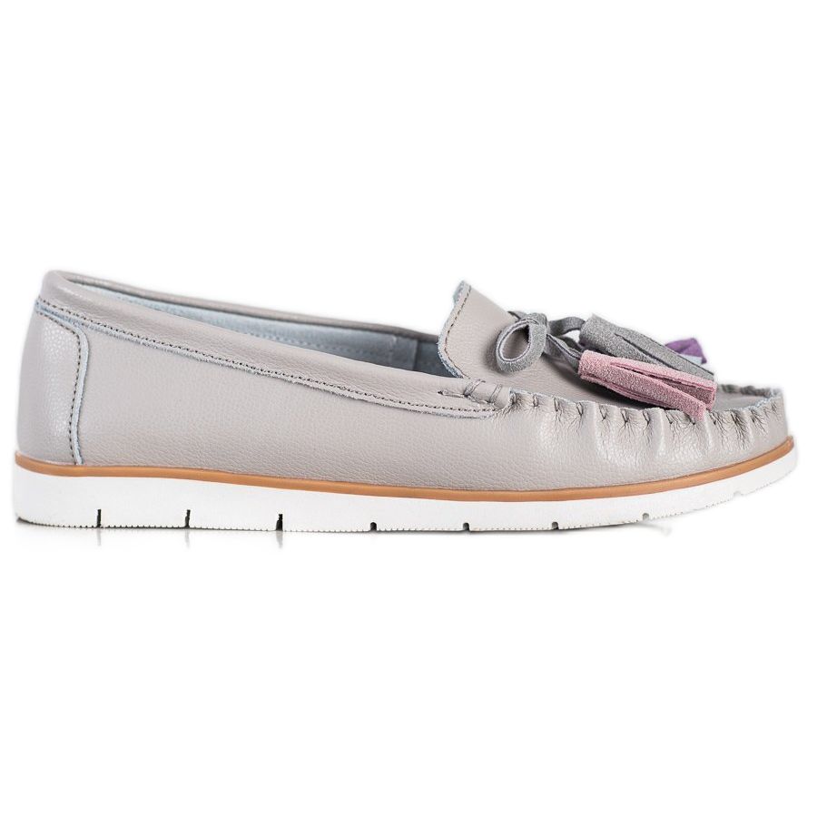 Az Evento mokaszinokat egy elbűvölő részlet jellemzi - egy dekoratív, színes rojtokkal díszített masni, amely vonzza a tekintetet és könnyedséget kölcsönöz az egésznek. A beépített, puha sarokpult kényelmes viseletet biztosít, így ideális választás a mindennapi használatra. A szintetikus, lapos talp futófelülettel stabilitást és kényelmet biztosít, így minden lépést élvezhet.