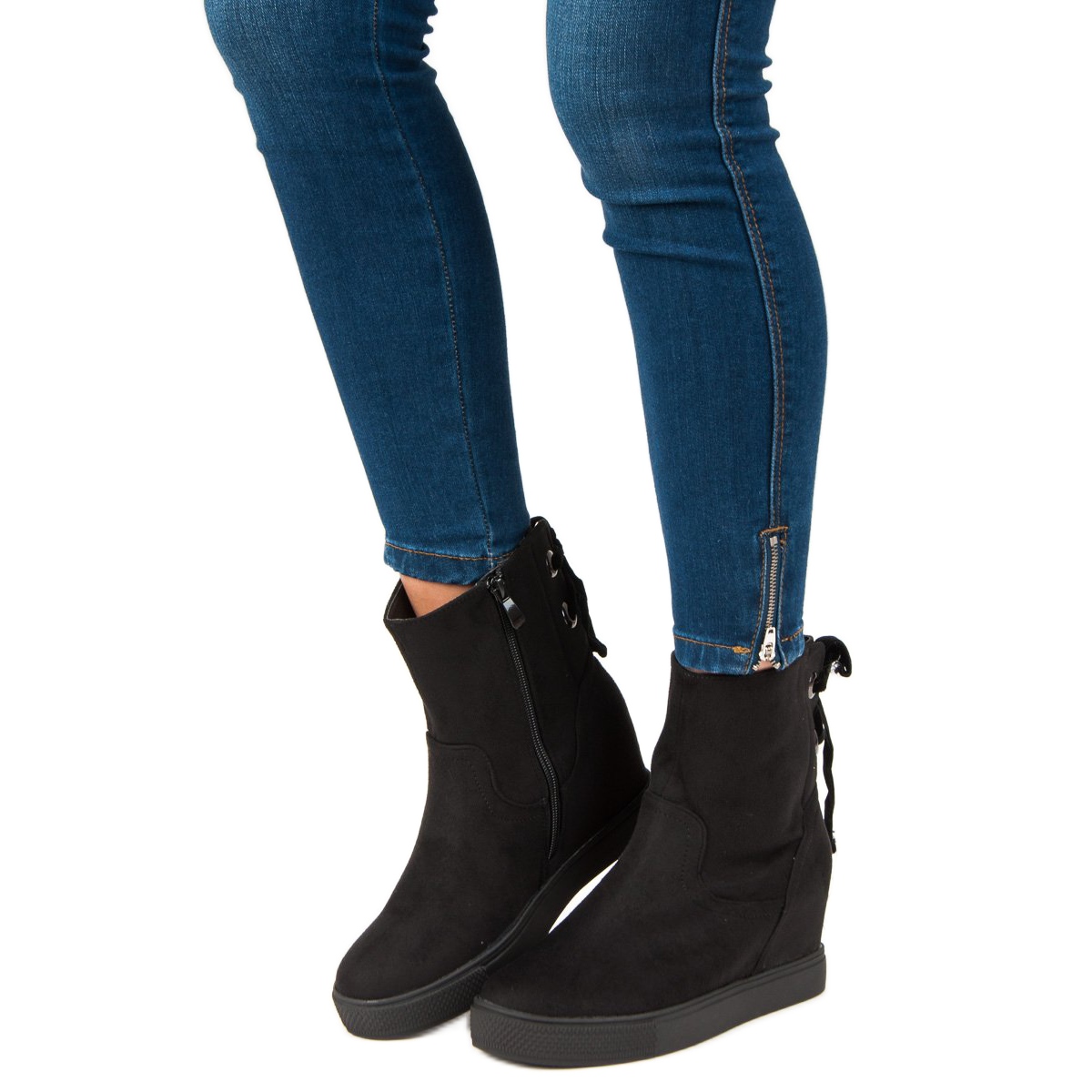 A cipő belsejében elrejtett diszkrét 10 cm magas ék nemcsak stílust ad a cipőnek, hanem optikailag is meghosszabbítja a lábszárat. Egy fenomenális részlet hátul egy dekoratív masni formájában kecsességet és nőies bájt kölcsönöz nekik. Ez a bokacsizma tökéletesen passzol a fekete nadrághoz, elegáns és karcsú megjelenést biztosítva.