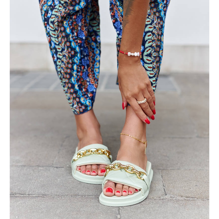 Ismerje meg Inna Marki egyedi, Borgo lánccal díszített zöld papucsait! Ezek a stílusos papucsok a tökéletes választás a nyári napokra, kombinálva a kényelmet és a divatos hangsúlyokat, amelyekkel kitűnhetsz a tömegből.