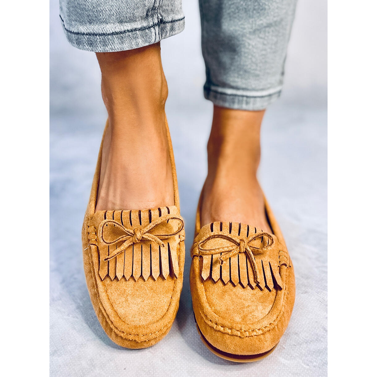 A mokaszinok lapos sarka mindössze 1 cm magas, így tökéletes mindennapi használatra. Ezenkívül a kerek orr és a szintetikus talp biztosítja a kényelmet és a stabilitást minden lépésnél. A rojtok és a masni érdekes felülete ezt a cipőt minden stílus divatos akcentusává teszi.