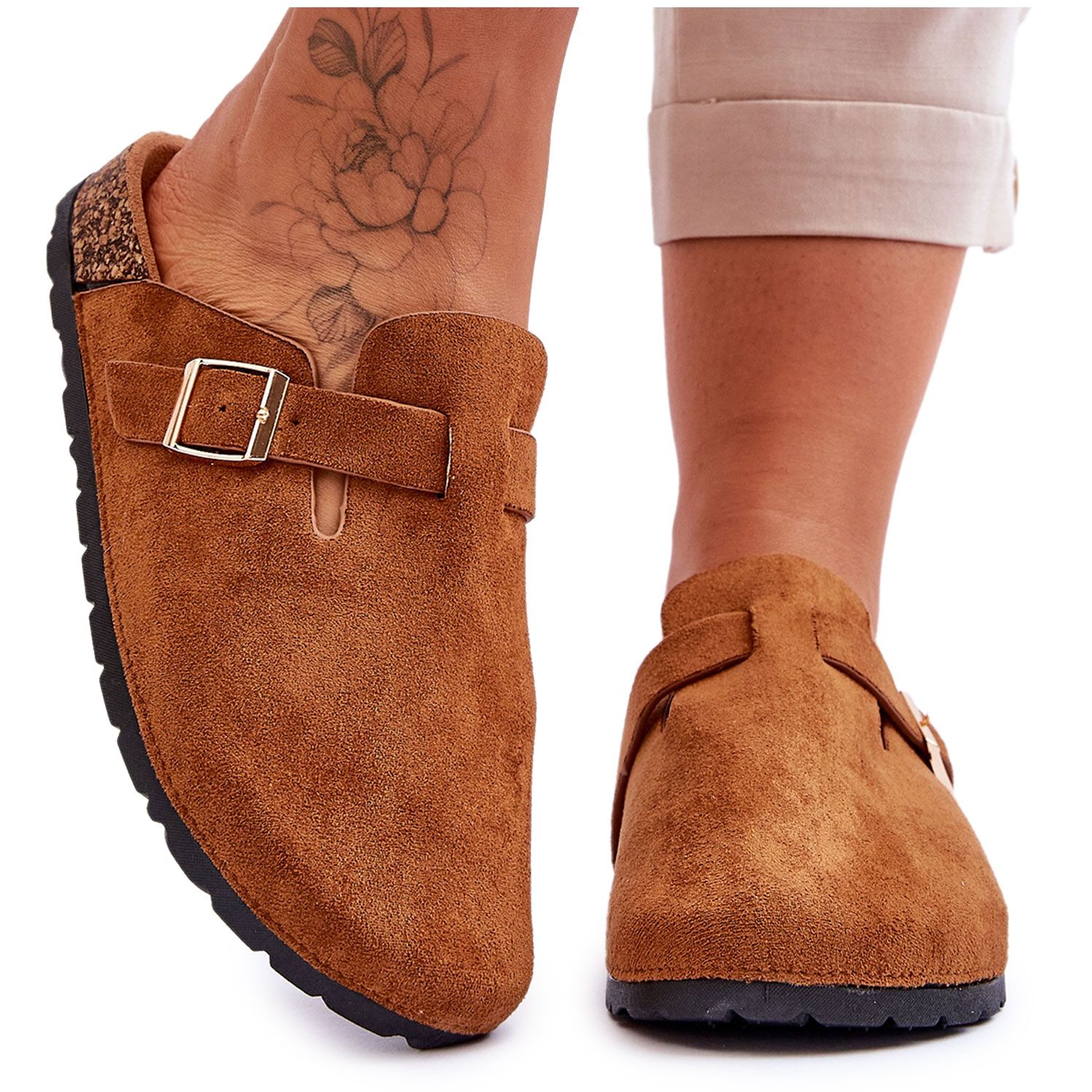 A papucsok könnyű parafa platformra vannak felszerelve, mely 2,5 cm magas, mely kiváló párnázást biztosít járás közben. A műanyag talp tartósságot és jó tapadást garantál. Az öko-velúrból készült profilozott talpbetét biztosítja a láb kényelmét, egy további állítható pánt csattal pedig tökéletes illeszkedést tesz lehetővé bármely lábhoz.