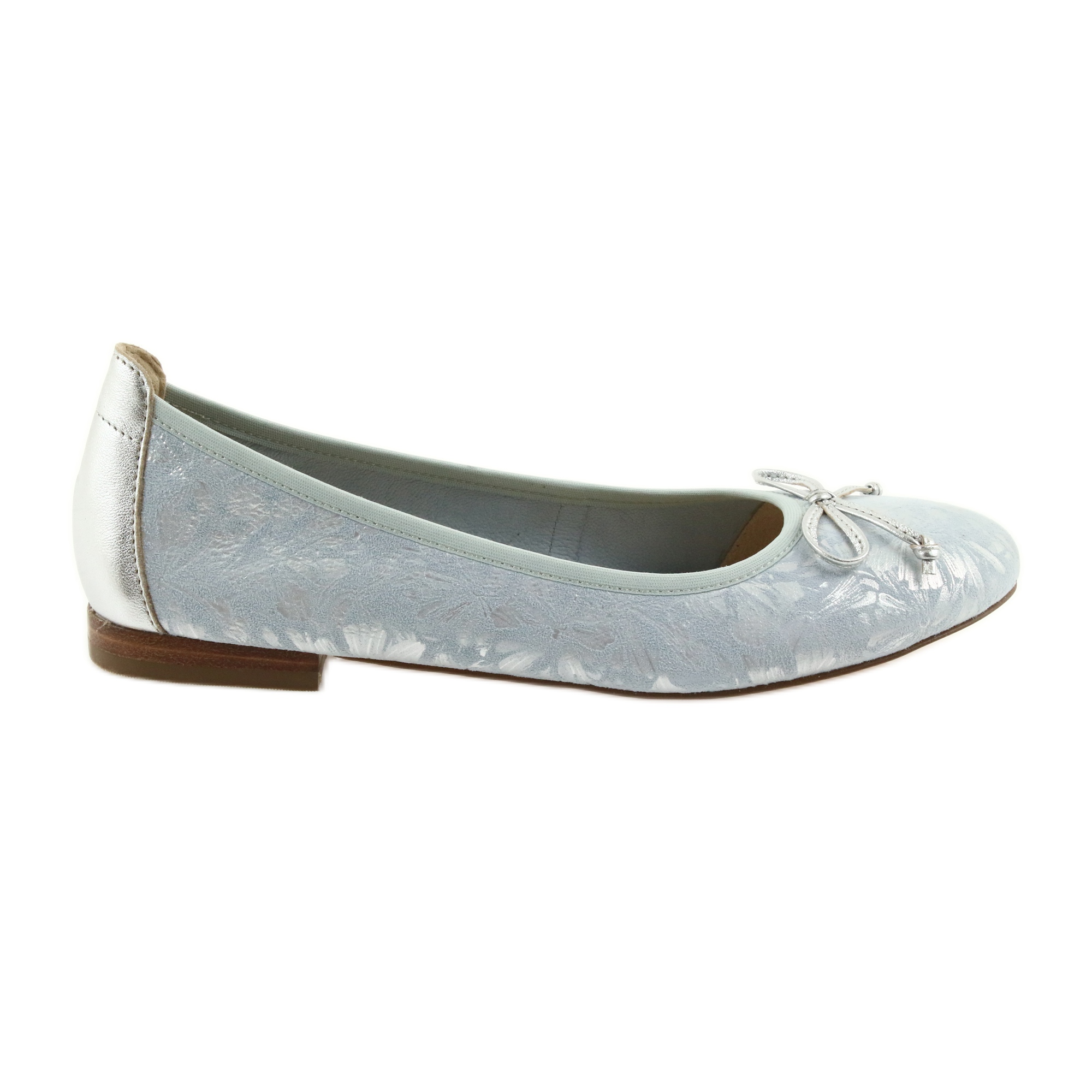 Elegáns és kényelmes Caprice balerinák finom kék árnyalatban, finom virágmintával és ezüst íj, elöl. A természetes nubuckból készültek, és egyesítik a klasszikus vonalat a mindennapi kényelemmel - ideális munkához, sétához vagy találkozáshoz.