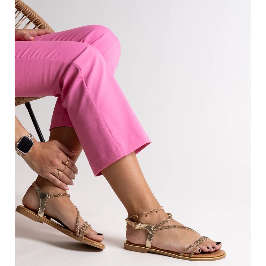 A Caramella cirkonjaival díszített arany szandál kötelező ezen a nyáron! Ezek az elegáns, könnyű, lapos, lapos cipők kombinálják a kényelmet és a divatos kialakítást, amely lenyűgöz. Klasszikus vágásuknak köszönhetően tökéletesen illeszkednek a nyári stilizációkba, mind a tenger melletti sétára, mind a nyári partira.