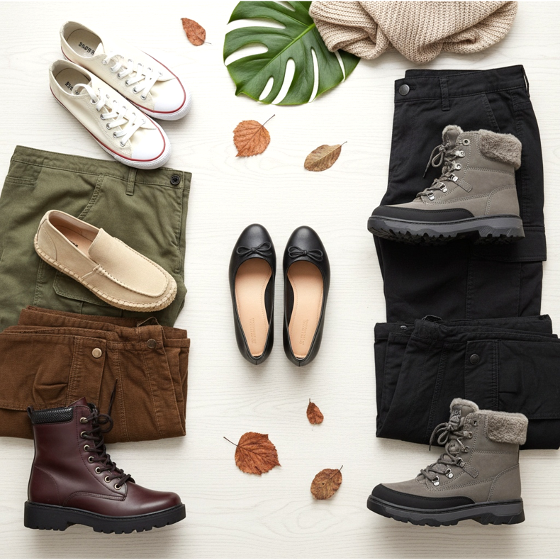 A melegebb napokon, amikor vékony cargo nadrágot választasz, a tornacipők, mokaszinok vagy akár a szandálok is tökéletesek lesznek. Ezek a tehernadrágos cipők könnyűek, szellősek és még hosszú séták során is kényelmet biztosítanak. Választhat balettlakásokat is, amelyek egy csipetnyi eleganciát kölcsönöznek nyári stílusának.
