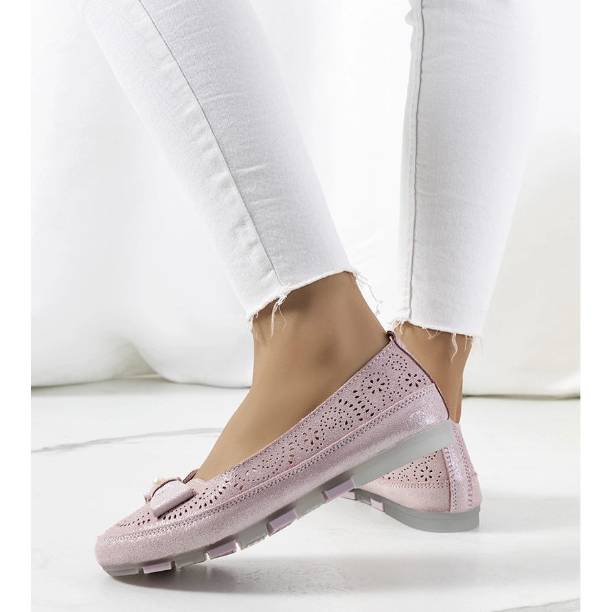 Elegáns Catania cipők, kiváló minőségű természetes velúr bőrből, nőies, rózsaszín árnyalatban. A felső részét finom nyílt mintázat és fényes részecskék díszítették, és a dekoratív íj egész varázst ad. A puha, profilozott természetes bőrbetét még hosszú kopással is biztosítja a kényelmet. A szürke gumi talp garantálja a jó tapadást és könnyedséget. Az alacsony vágású modell tökéletes a meleg napokhoz - nyári kollekcióhoz.