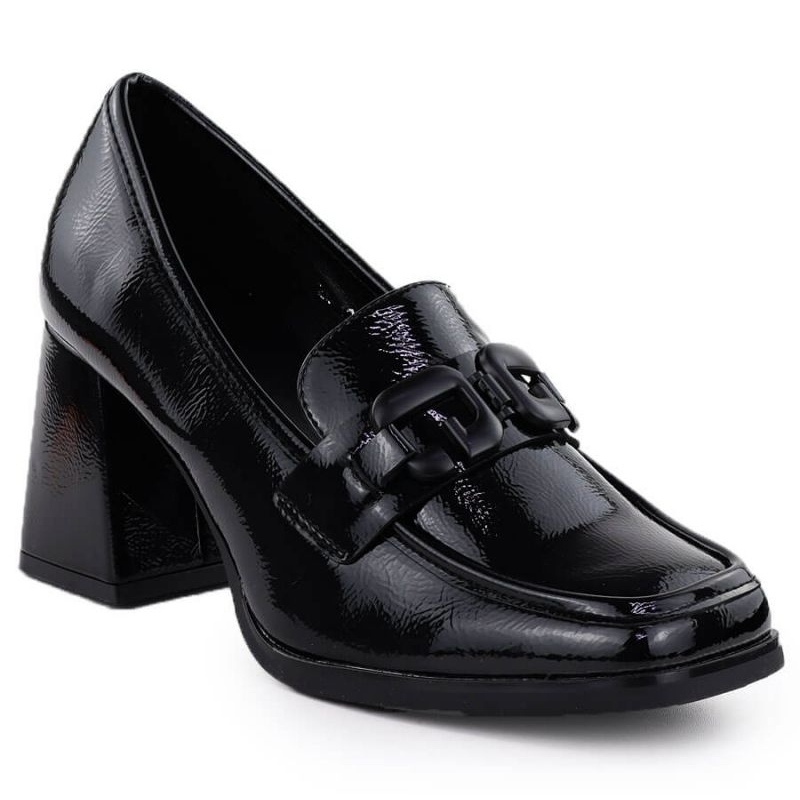 Ezeket a cipőket szilárd sarokba állítják, 8 cm magasságú, ami finom stílust és eleganciát ad, miközben biztosítja a stabilitást. A klasszikus fekete színeknek és a lánc formájában látványos dekorációnak köszönhetően tökéletesen belekeverednek a különféle stilizációkba - a mindennapi és a formálisabbak.