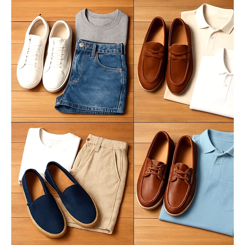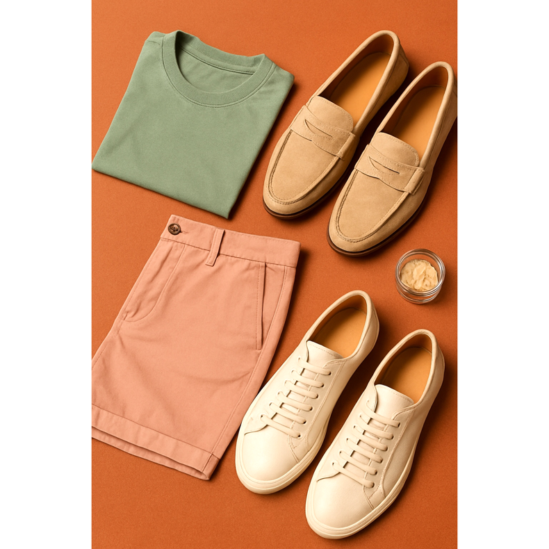Világos rövidnadrág (bézs, fehér) → sötétebb cipő (tengerkék, barna).