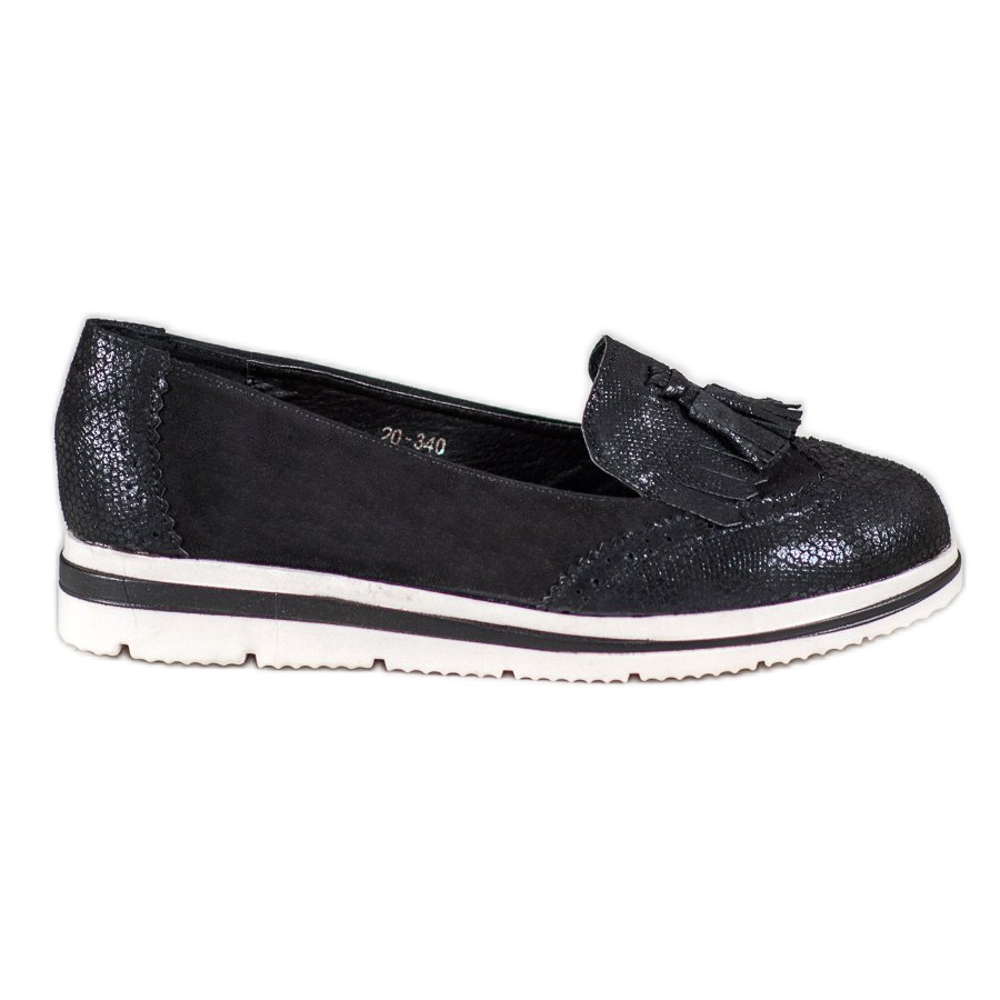 Rendkívül univerzális, fekete naplopók tökéletesen illeszkednek a hétköznapi stílusba, tökéletesek a mindennapokra. További előny a puha, beépített sarok, amely kényelmes viseletet biztosít. A futófelülettel ellátott műanyag talp biztosítja a stabilitást és a tapadást különféle felületeken.
