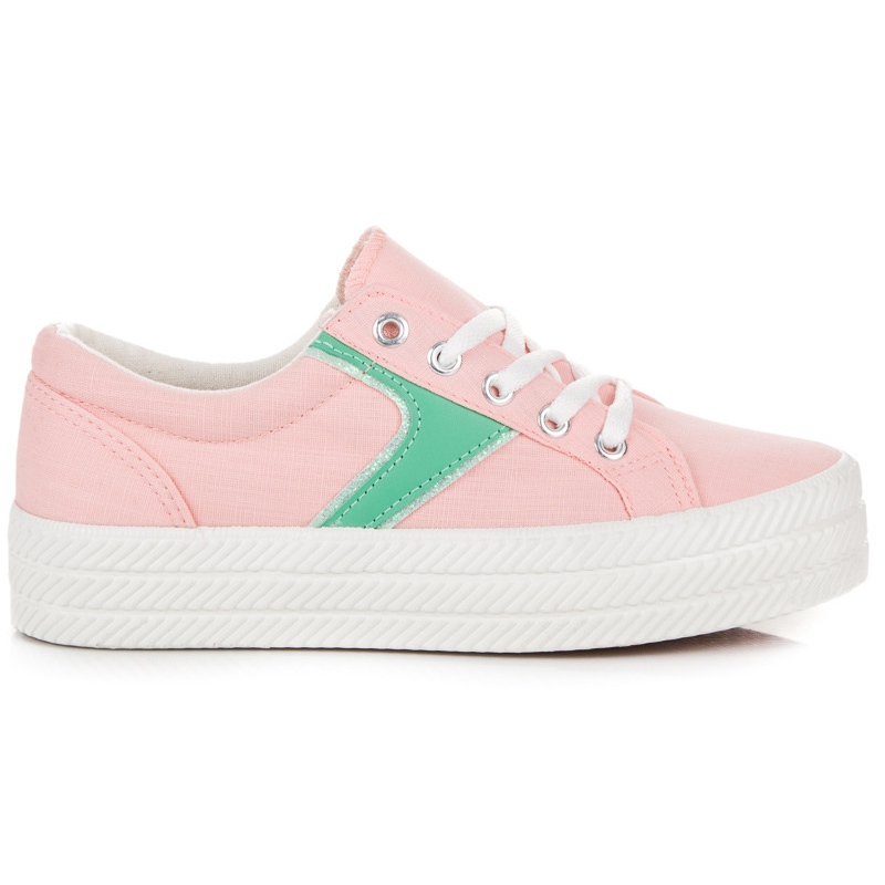 A tornacipők felső része kiváló minőségű textil anyagból készült, amely biztosítja a szellőzést és a viselési kényelmet. A rózsaszín szín varázsát egy finom zöld akcentus töri meg, divatos karaktert adva az egésznek. A tornacipők klasszikus fűzős rögzítéssel és kerek orrral rendelkeznek, ami kiemeli sportos stílusukat, tökéletes a mindennapi használatra.
