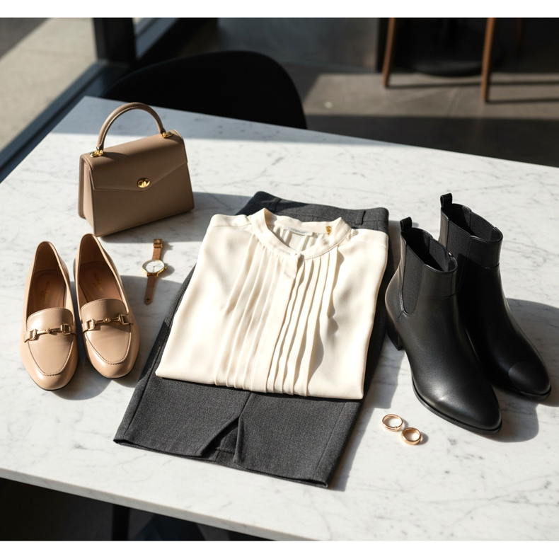 Elegáns cipő blúzzal és szoknyával az irodába