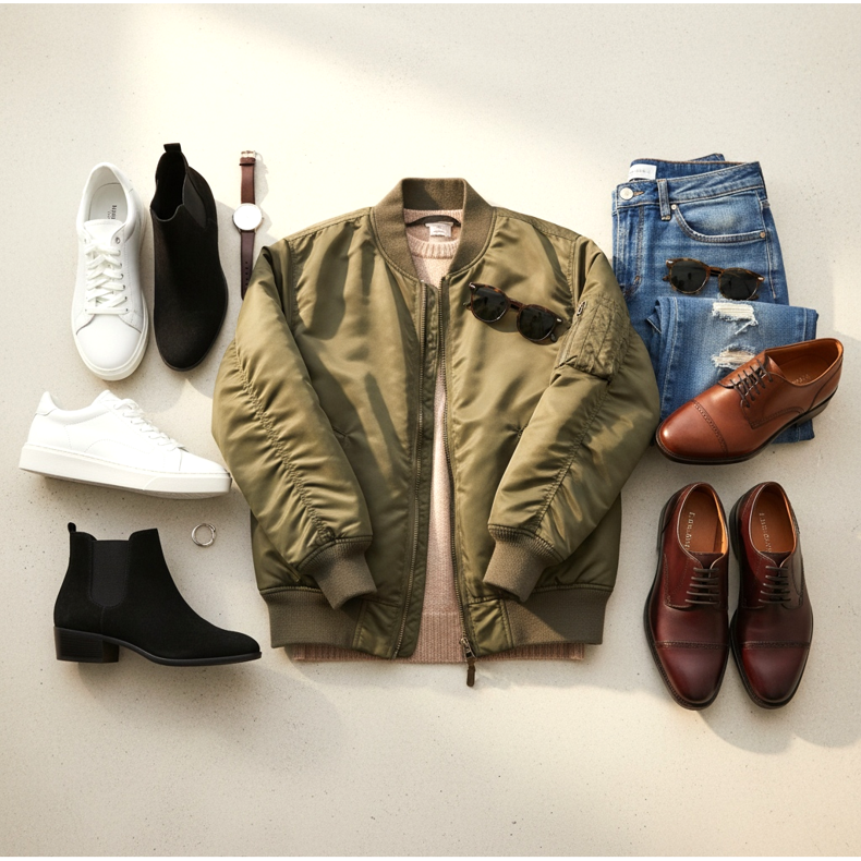 Cipők és tornacipők – klasszikus cipő bomber dzsekivel