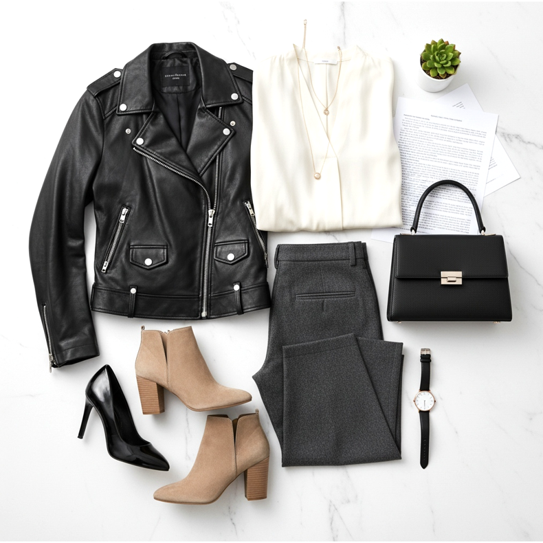 A bőrdzseki az irodában is viselhető, ha megfelelően formázza. Az elegáns, magas sarkú cipő a legjobb a munkához, mivel optikailag meghosszabbítja a lábát, és kecsessé teszi a sziluettjét.