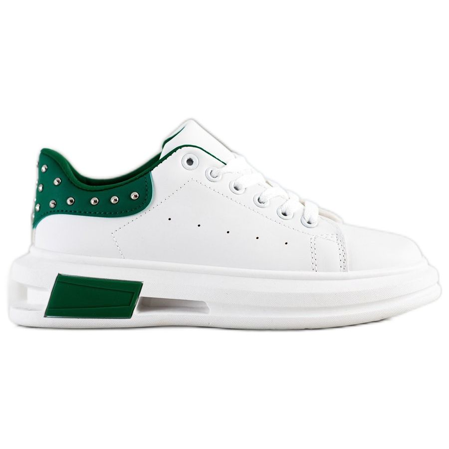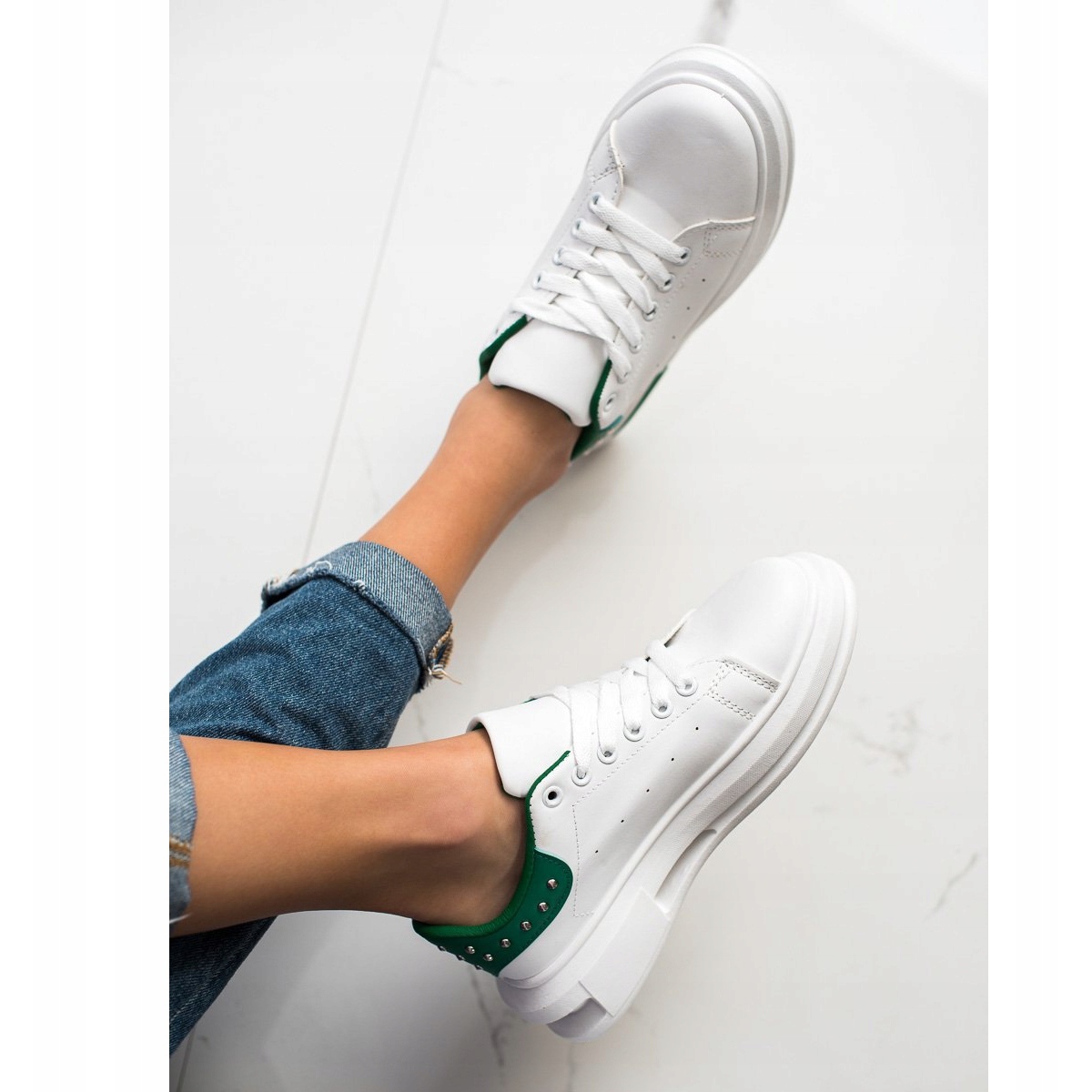 A fehér és zöld SHELOVET tornacipők tökéletes választás a mindennapi kényelmet és stílust kereső nők számára. Ezeket a sportcipőket a felépített, puha sarok és a divatos zöld színű hátoldal jellemzi, amelyet fém strasszokkal díszítenek, így egyedi karaktert adnak nekik.