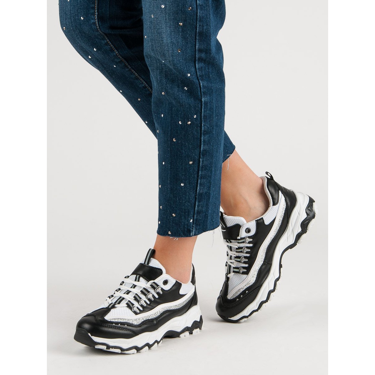 A fehér és fekete színekben pompázó csillámos tornacipők minden nő ruhatárának kötelező darabjai! Ezek a feltűnő cipők ötvözik a klasszikus dizájnt a modern akcentusokkal, így tökéletes választás minden alkalomra. A fekete-fehér színek egy időtlen páros, amely a sportcipőket tökéletesen passzolja a különféle stílusokhoz, a sporttól a hétköznapiig.