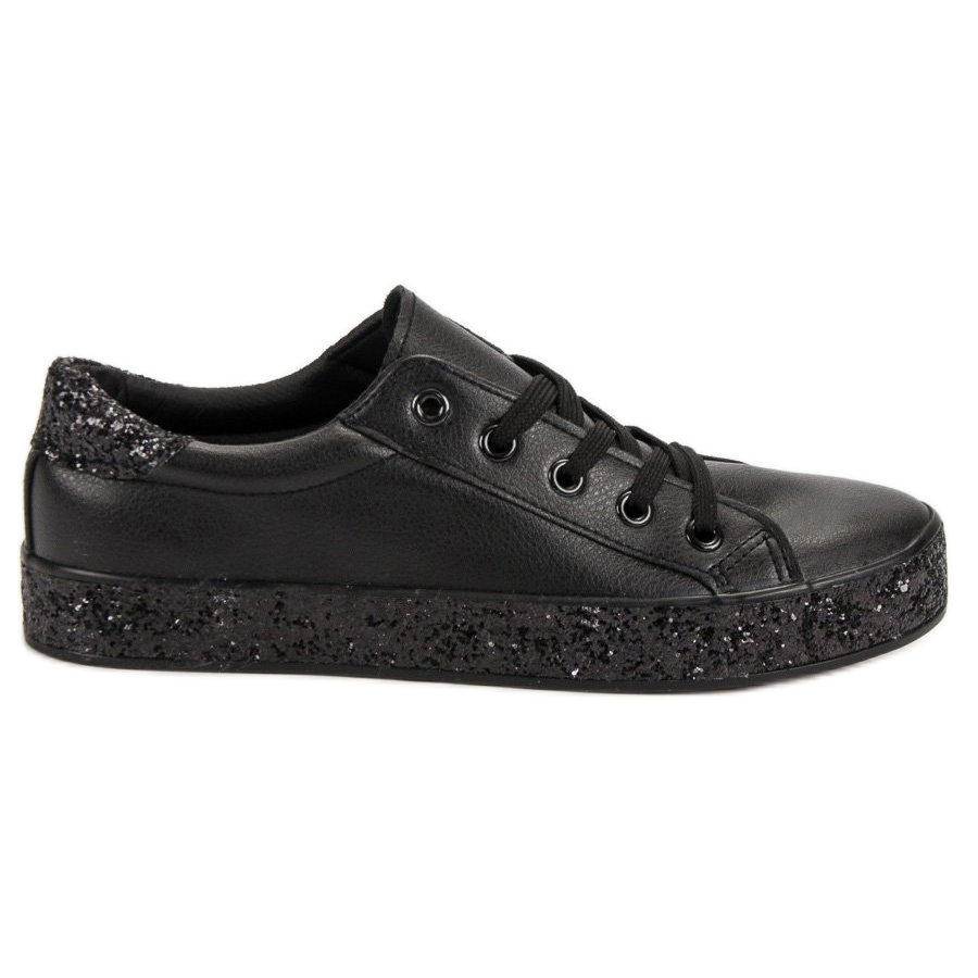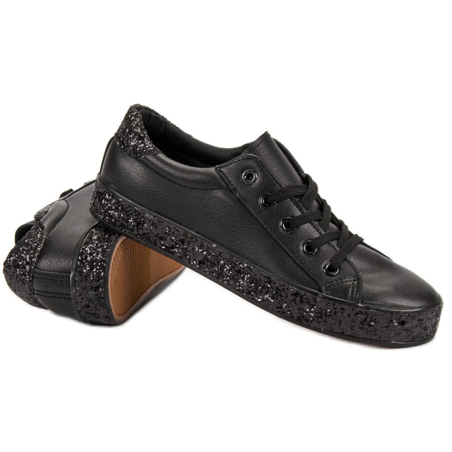 Egyedi, csillogó talpú fekete tornacipőt mutatunk be, mely tökéletes választás mindenkinek, aki szeretne egy kis csillogást adni mindennapi stílusához. A kiváló minőségű ökológiai bőrből készült divatos cipők a minőséget, a kényelmet és az eredeti dizájnt ötvözik.