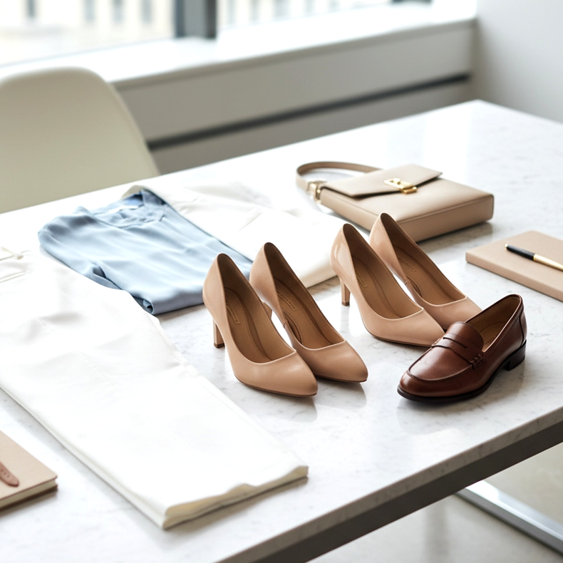 A bézs vagy meztelen cicasarkú egy másik nagyszerű irodai lehetőség. Egyszerre elegánsak és kényelmesek – tökéletesek a hosszú munkanapokhoz. A barna vagy fekete bőrcipők érdekes kontrasztot alkotnak a fehér nadrággal, és a modern, európai elegancia hatását keltik.