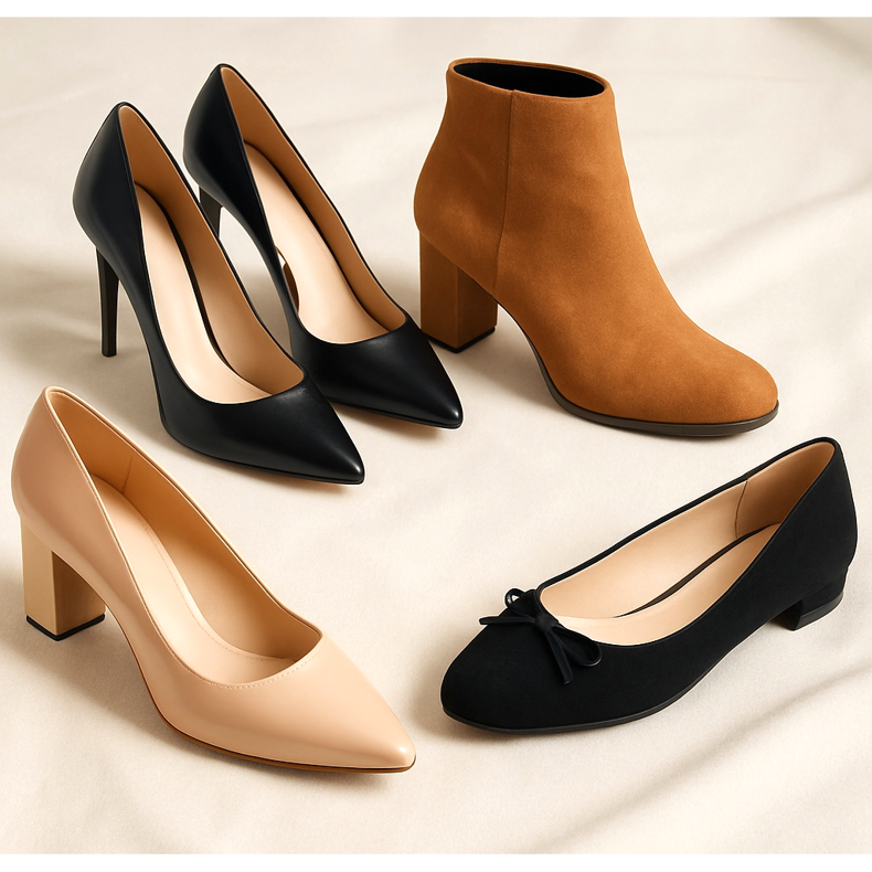 A klasszikus közepes sarkú pumpák a leguniverzálisabb formális cipők a nők számára. A fekete vagy bézs színű pumpák gyakorlatilag bármilyen elegáns stílushoz passzolnak. A zárt lábujj és sarok miatt még a legkonzervatívabb környezetben is használhatók. A blokk sarok stabilitást biztosít hosszú események során. Ideális irodába, állásinterjúkra és hivatalos megbeszélésekre.