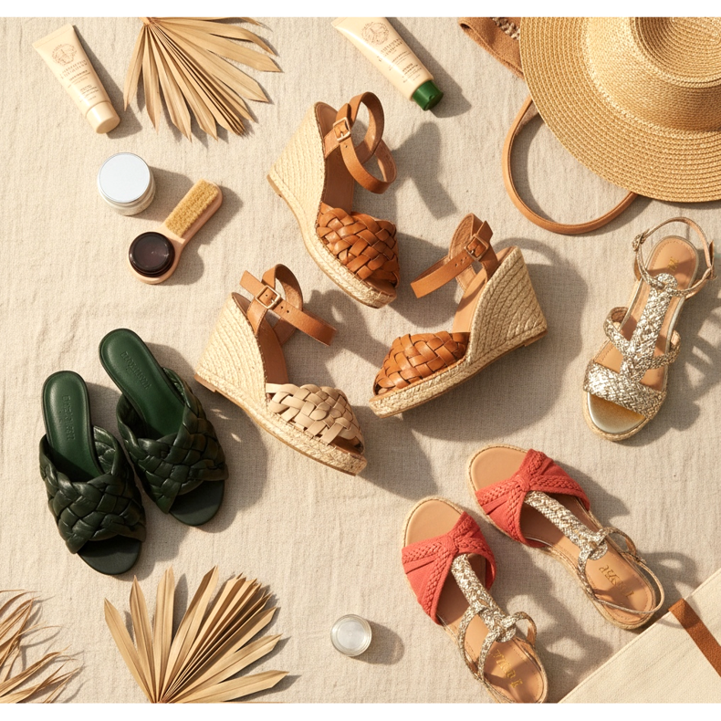 Espadrillek rattan talppal: A klasszikus espadrille juta, szövött talp és anyag felső kombinációja. 2026-ban kifinomultabb változatok érkeznek – bőrkrémmel, fémes részletekkel vagy mindenhol szövött mintákkal. Ez a cipő tökéletes nyaraláshoz és nyári sétához a városban.