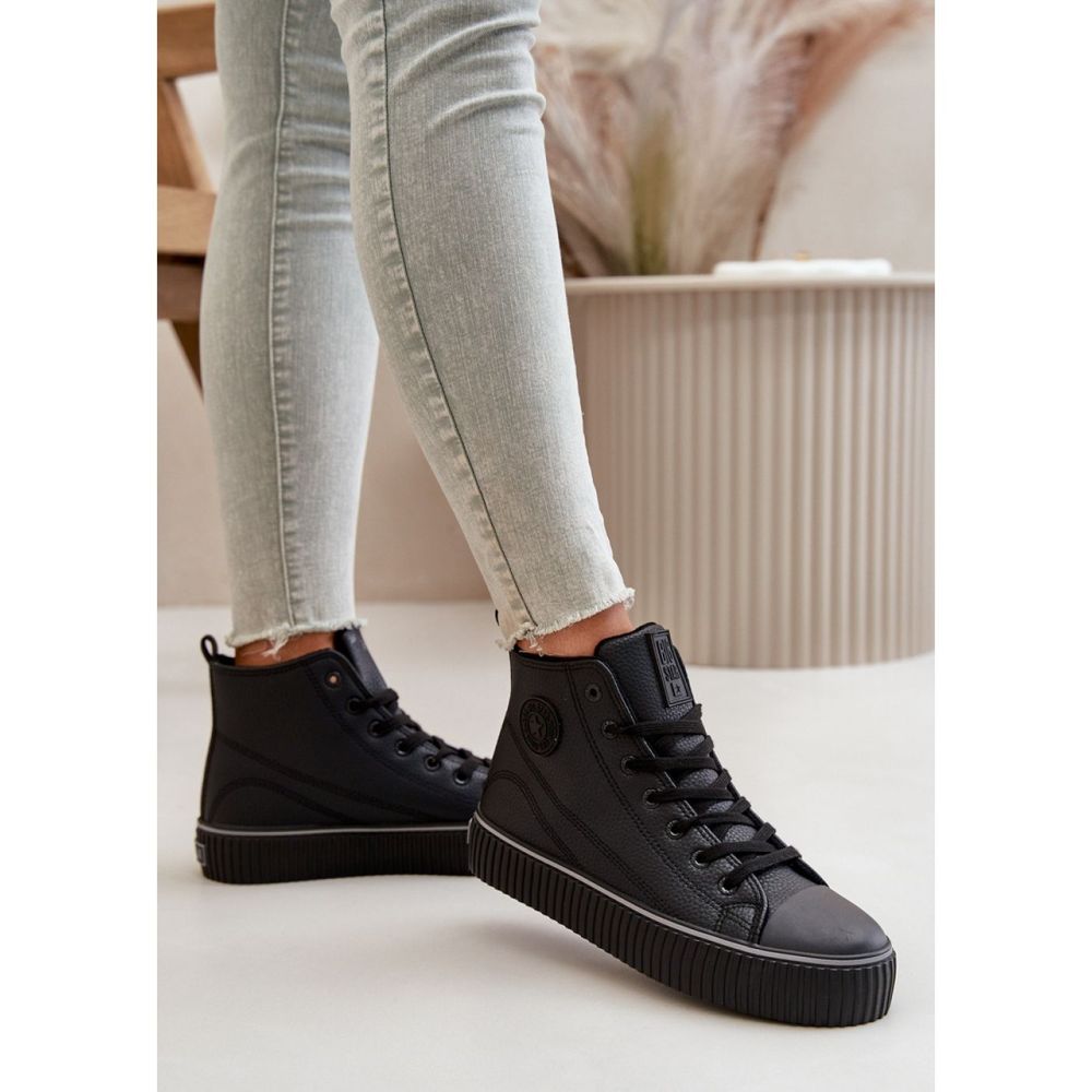 Modell Big Star OO274790 Black - Stept Style Sneakers a kényelem és a divatos formatervezés tökéletes kombinációja, amely minden helyzetben működni fog. Kiváló minőségű ökológiai bőrből készültek, ezek a fekete cipők nemcsak stílusosak, hanem környezetbarátak is. Egy további boka felső és egy szilárd, gumi platform, amelynek magassága 3,5 cm garantálja a stabilitást és a viselet kényelmét.