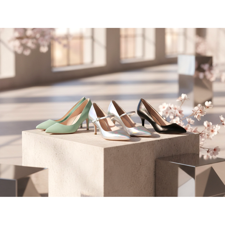 A szezon egyik leghíresebb újdonsága a cicasarkúk visszatérése. Ezek az alacsony, karcsú, 3-5 cm magas sarkú cipők tökéletesen egyensúlyoznak az elegancia és a kényelem között. A kifutókon a hegyes orrú modellek domináltak, pasztell színekben és fémes változatokban.