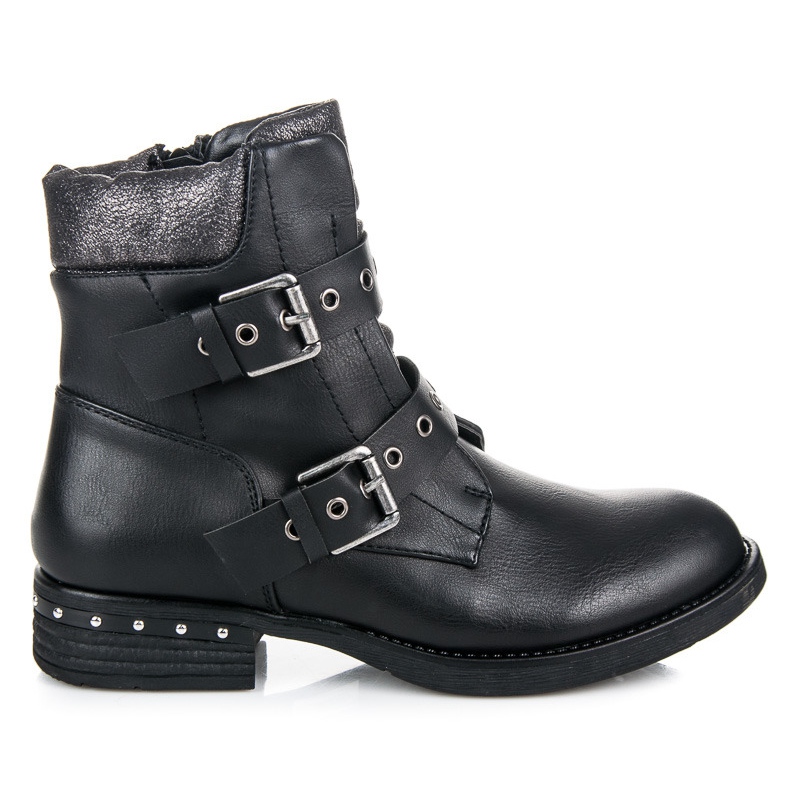 A kiváló minőségű ökológiai bőrből készült munkásokat dekoratív csatok és finom kristályok jellemzik, amelyek eredetiséget adnak. A 14 cm magas és 22 cm széles felsőrész hatékonyan illeszkedik a lábszárhoz, egyszerre nyújt tartást és kényelmet. A kerek orr és a beépített, merevített sarok garantálja a kényelmes viseletet, a lapos, 3 cm magas sarok pedig tökéletessé teszi a mindennapi használatra.