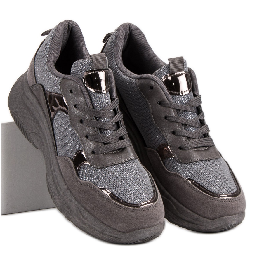 Fedezze fel a szürke csillogó platformú tornacipőket, amelyek ruhatárad nélkülözhetetlen elemei lesznek! Ezek az egyedi, ökológiai lakkbőrből készült női tornacipők az eleganciát és a kényelmet ötvözik. 5 centiméteres, karcsú formával és könnyedséggel jellemezhető platformjával kiváló választás mindennapi használatra és hétvégi hegyi kirándulásokhoz vagy pihentető parki sétákhoz.