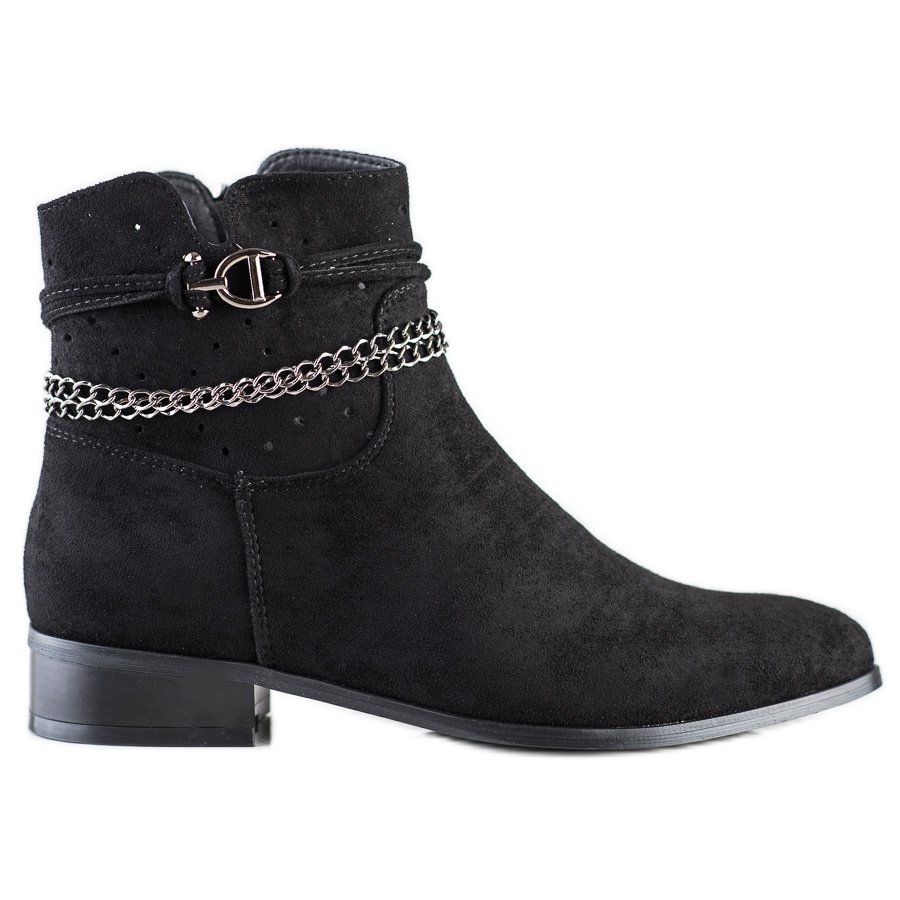 A fekete dekoratív lánccal ellátott VINCEZA bokacsizma ideális választás azoknak a nőknek, akik értékelik az eleganciát és a kényelmet a mindennapi használat során. Kiváló minőségű velúrutánzatból készültek, stílusos és lezser karakterrel rendelkeznek, tökéletesek az őszi/téli szezonra.