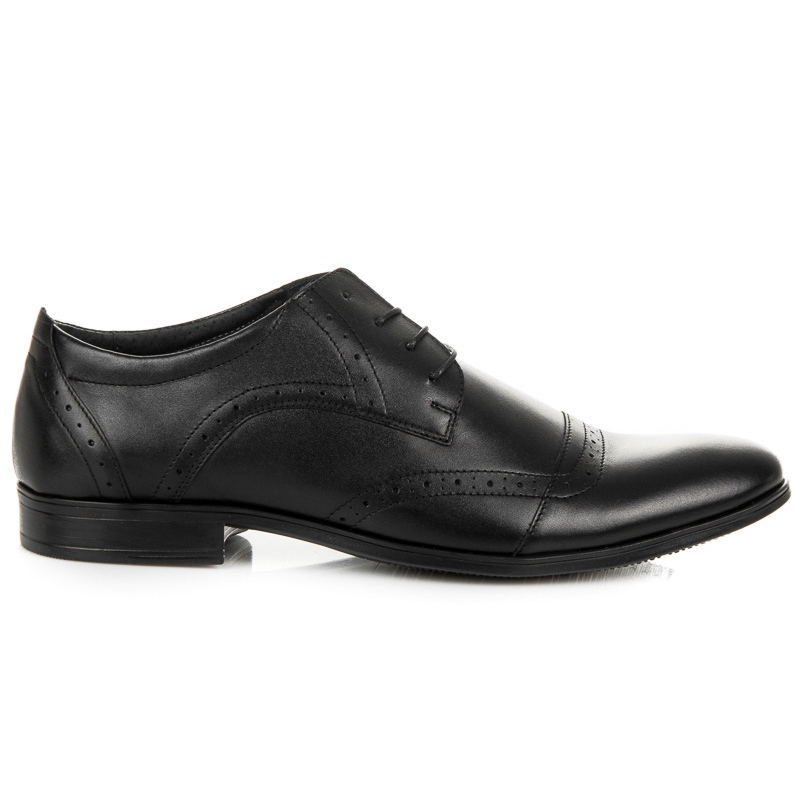 Lucca - férfi cipő klasszikus, elegáns változatban. A fekete, sima természetes bőr és az időtlen szabás miatt a modell tökéletesen passzol öltönyhöz és más elegáns stílusokhoz. A stabil, lapos műanyag talpnak köszönhetően a cipő kényelmes járást biztosít, és lehetővé teszi a hosszú órákon át tartó táncolást.