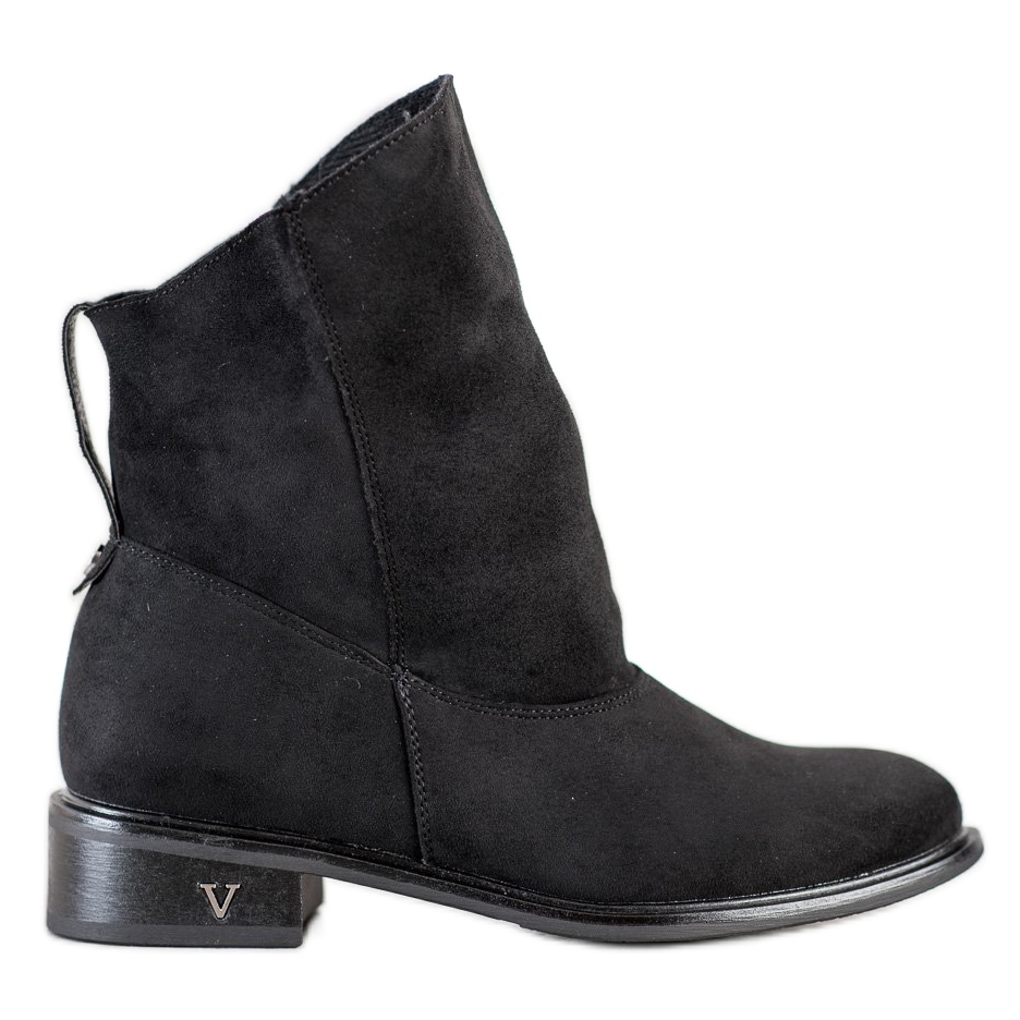 A fekete Gogo bokacsizma tökéletes választás a közelgő őszi és téli napokra. Kiváló minőségű, velúrutánzó ökológiai bőrből készültek, és a modern dizájnt kombinálják a viselési kényelemmel. A 12-13 cm magas és 32 cm széles felsőrész minden lábra könnyedén illeszkedik, a bokavágás pedig elegáns karaktert kölcsönöz.