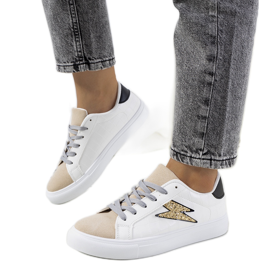 Fehér és bézs cipők dings (F023 modell) stílus és kényelem minden nap. A fehér és a bézs és a különféle anyagok kombinációja divatos, kissé sportos megjelenést és finom mintát hoz létre a felső részén lévő krokodil stílusában. A lágy gumi talp kényelmet nyújt még hosszabb séták során is.