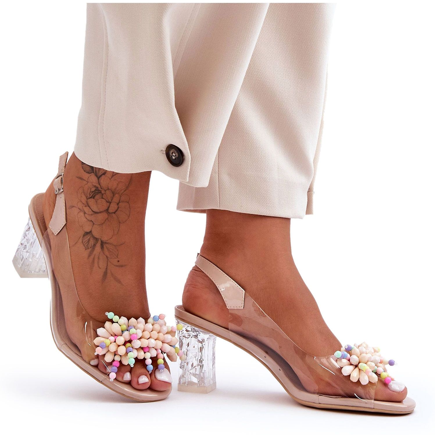 Elegáns szandál S. Barski MR1037-23 egyesíti a modern minimalizmust és a finom fényt. Az átlátszó felsőt egy átlátszó 7 cm -es oszlopra állítják, és az elülső részét számos gyöngy és strassz díszíti, multi -kolorált hangon, amelyek könnyű, egyedi karaktert adnak hozzá. A bézs árnyék (bézs) a cipőt rendkívül sokoldalúvá teszi - tökéletes nyári ruhákhoz, alkalmi készletekhez vagy elegánsabb megjelenésű.