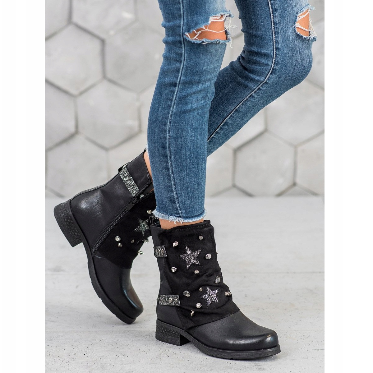 A részletekre mutatva lehetetlen figyelmen kívül hagyni az ezüst strasszokat és a csillag alakú mintákat. Egyedülálló akcentust jelentenek, rock szellemet kölcsönöznek megjelenésének, és eleganciát adnak. A 3,5 cm-es lapos sarok diszkrét és kényelmes viselet egész nap.