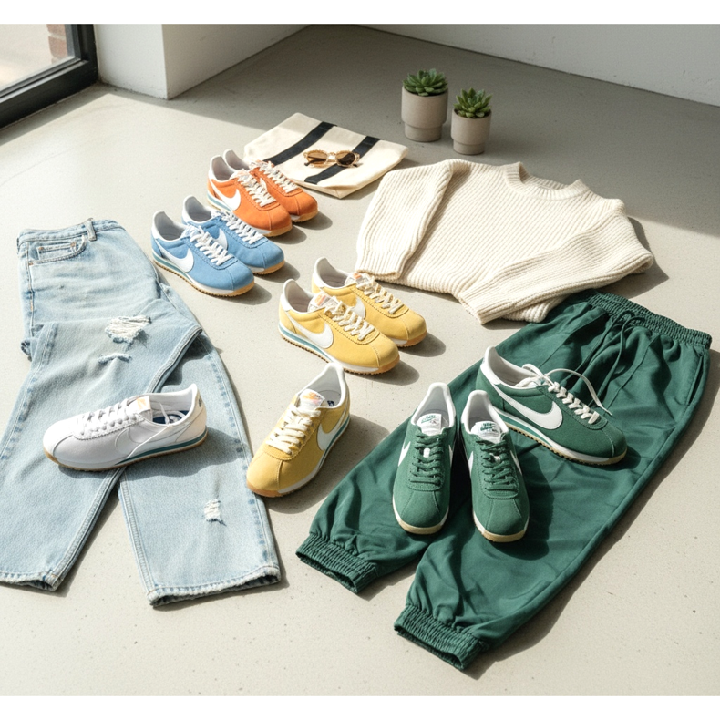 A retro futók remekül működnek farmerkombinációval: egyenes szárú nadrág és klasszikus ing vagy túlméretezett pulóver. Érdemes kipróbálni egy kombinációt is nagy atlétával vagy széles szárú nadrággal – a cipő keskeny sziluettje és a széles szár közötti kontraszt csodákra képes. Az új tavaszi színekben pompázó Nike Cortez és Adidas Gazelle modellek különösen népszerűek lettek, és világszerte megjelennek az influencerek gardróbjában.