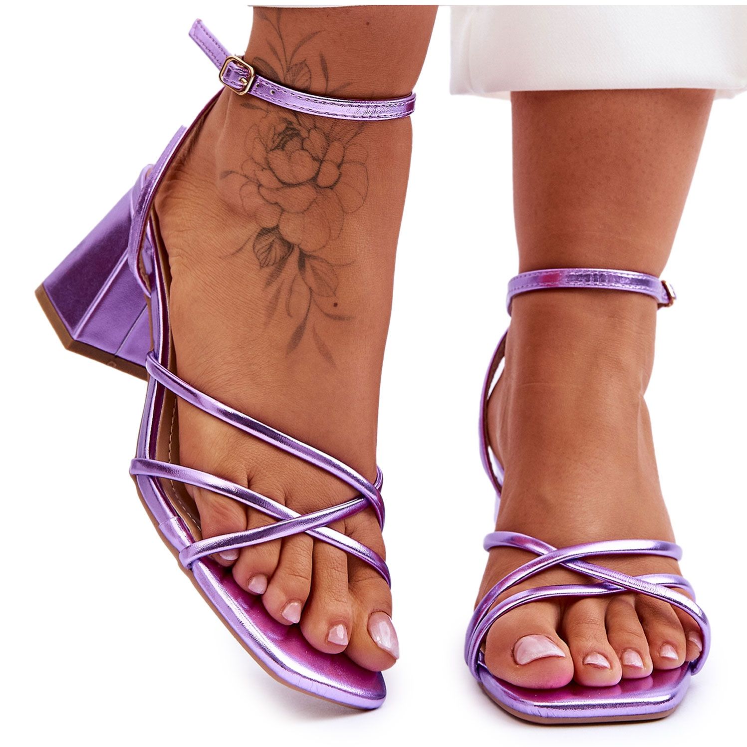 Alacsony sarkú, 6,5 cm magas sarok formájában, tökéletesek különféle nyári ünnepségekre, mint például esküvők, bulik vagy randevúk. A lila szín elegáns bézs árnyalatokkal tökéletesen illeszkedik a legújabb divatirányzatokba, a fémes elemek pedig elegánssá teszik.