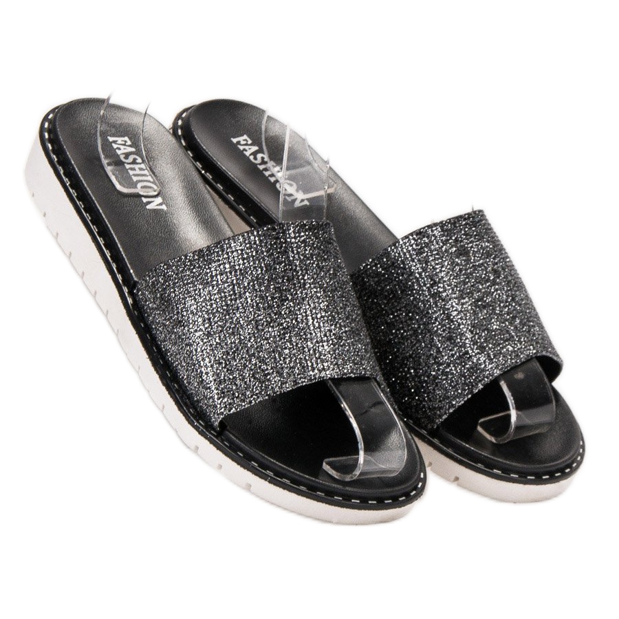 A Fashion márka divatos fényes fekete papucsai tökéletes választást jelentenek minden nő számára, aki szeretne kitűnni a nyári stílusban. Ezek az elegáns fekete papucsok ötvözik a stílust és a kényelmet, így tökéletes mindennapi kiegészítők. Tetszetős dizájnjukat kis cirkóniák formájú dekorációk hangsúlyozzák, amelyek hihetetlen fényt adnak a cipőknek.