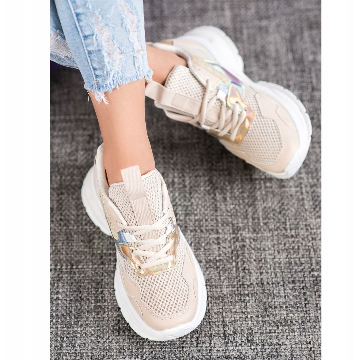 A barna szín csillogó, színes betétekkel különféle formákban nem csak funkcionálissá teszi ezeket a cipőket, hanem divatos divatstílusával is kitűnik. A futófelülettel ellátott gumitalp kiváló tapadást biztosít, az 5,5 cm-es platformmagasság pedig egy kis karaktert ad a kényelem korlátozása nélkül.