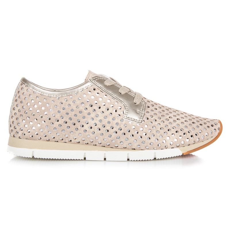 A tornacipők kiváló minőségű ökológiai bőrből készültek, áttört mintájuk pedig eredetiséget és könnyedséget kölcsönöz nekik. A színek – a sárga, arany, barna és bézs harmonikus kombinációja – sokféle öltözékhez passzolnak. A cipő belseje puha szövettel bélelt, amely hosszú viselés esetén is biztosítja a kényelmet.