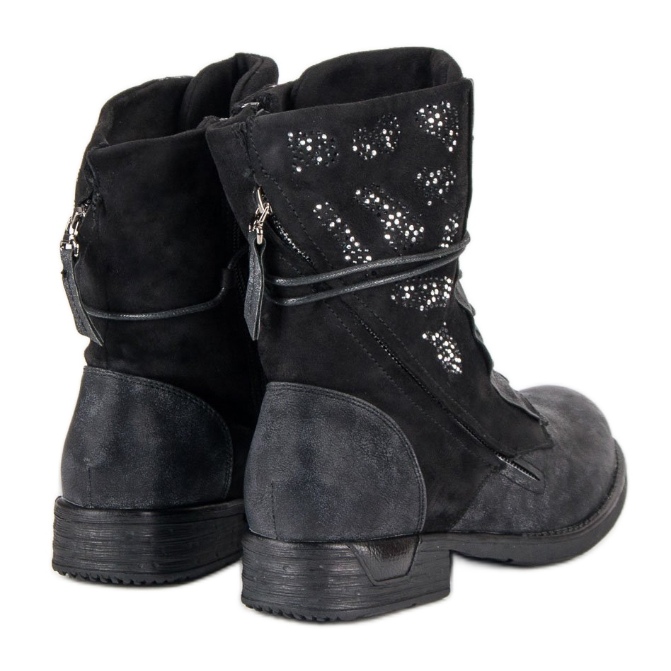 A munkásokat velúr bevonat jellemzi, amelyet fényes cirkóniák díszítenek. Ennek köszönhetően minden pár felkelti a figyelmet, és karaktert kölcsönöz a legegyszerűbb stílusnak is. Ezenkívül az alacsony, 3 cm-es sarok kényelmes viseletet tesz lehetővé egész nap, anélkül, hogy feláldozná a divatos megjelenést.