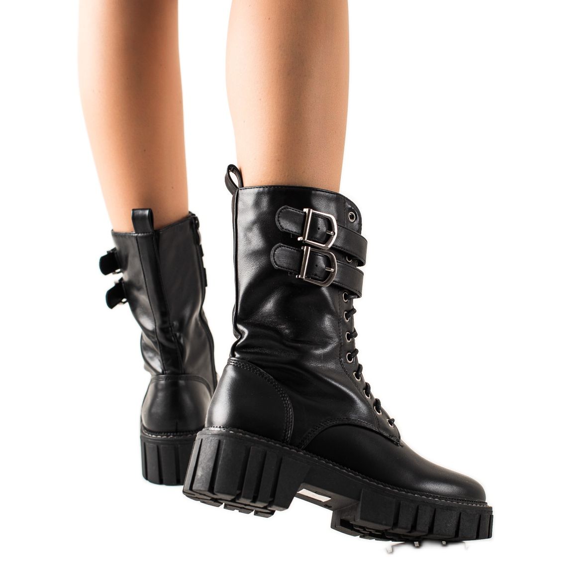 A fekete munkáscsizmákat egy dekoratív csat különbözteti meg, ami egy kis karaktert ad, és vonzó kiegészítője lehet bármilyen öltözéknek. A magas, bokáig érő felsőnek és a 3 cm magas platformnak köszönhetően kiváló választás a hidegebb napokra.